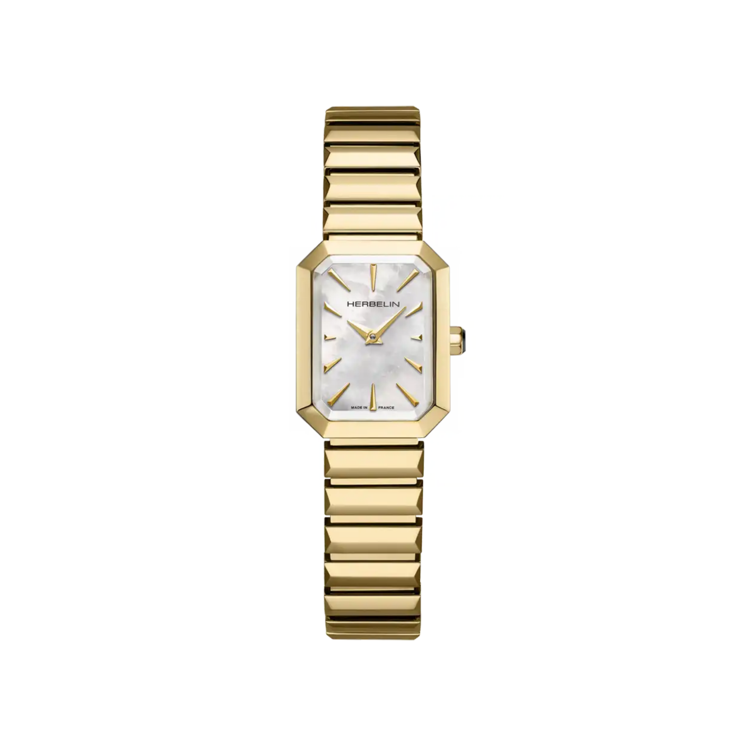 Michel Herbelin, maison horlogère française située dans le Doubs, nous propose une montre lumineuse et sculpturale. Elle se distingue par son boitier octogonal associé à un bracelet facetté à la finition miroir, et un revêtement en plaqué PVD or jaune. Le cadran en nacre blanche véritable apporte une touche de douceur. Très fine, elle renferme un mouvement quartz suisse, gage de fiabilité. Une montre-bijou audacieuse, véritable signature du chic français.