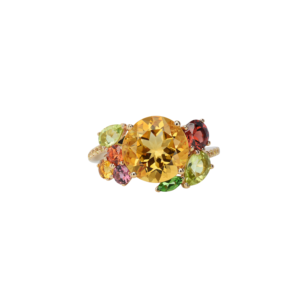 Inspirée par la nature, la bague Éden d’Isabelle Langlois dévoile un somptueux bouquet de pierres précieuses. En son centre trône une citrine étincelante, symbole de vitalité. Elle est entourée de pétales de gemmes aux couleurs éclatantes : rhodolite, saphir orange, péridot, grenat, tsavorite et saphir jaune. Montée sur or jaune, cette création incarne la joie, l’énergie et la beauté de la nature.