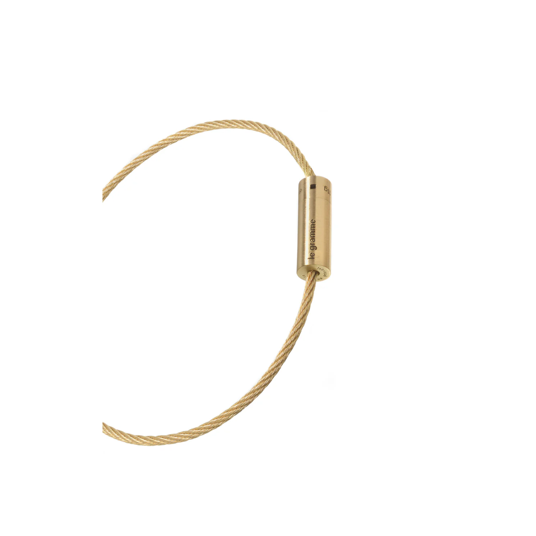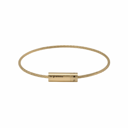 Inspiré par l’esthétique industrielle, le bracelet câble le 11g revisite l’idée de force et de finesse dans un bijou d’une grande simplicité apparente. Son câble torsadé en or jaune, à la fois souple et solide, s’attache par un fermoir cylindrique gravé du poids exact de 11 grammes.