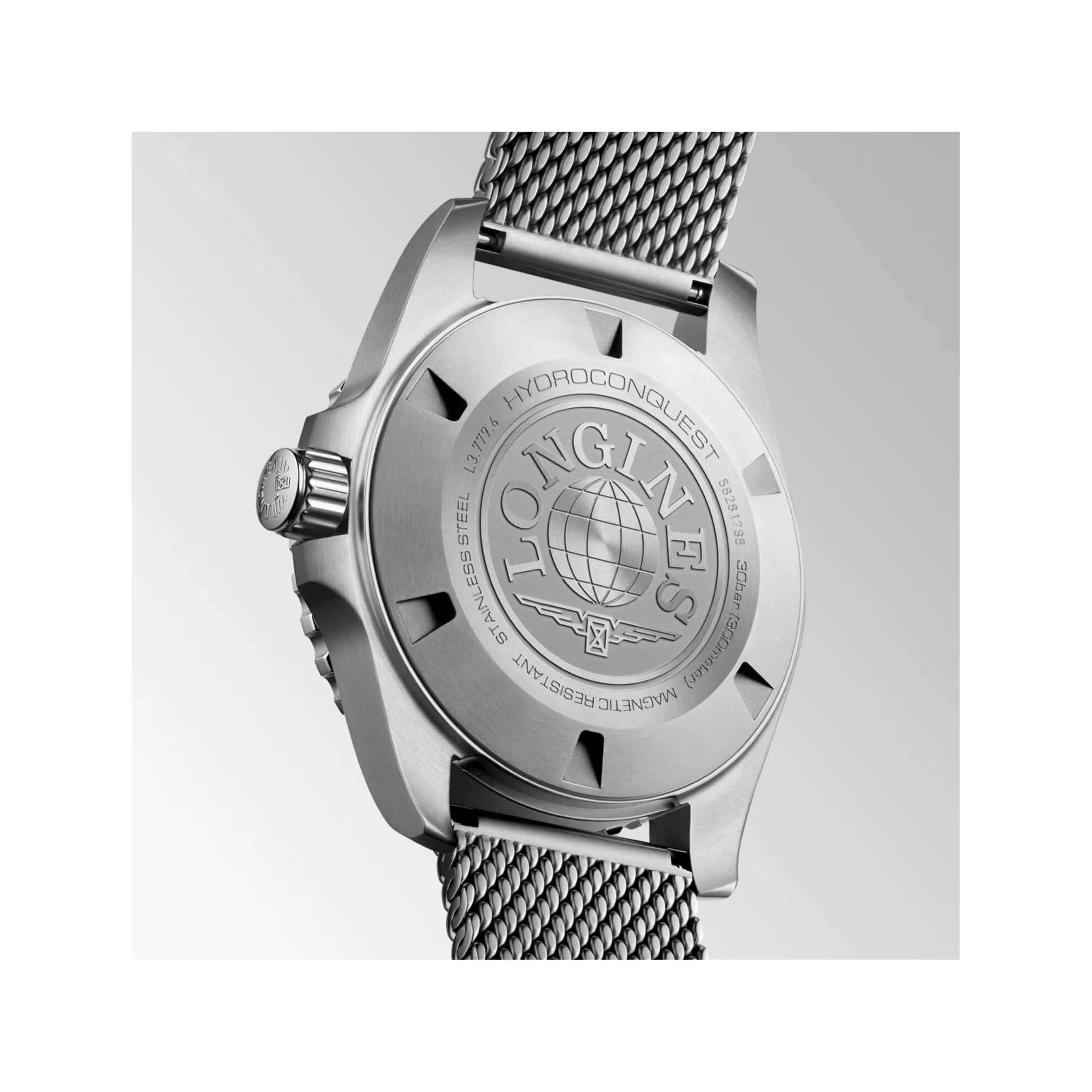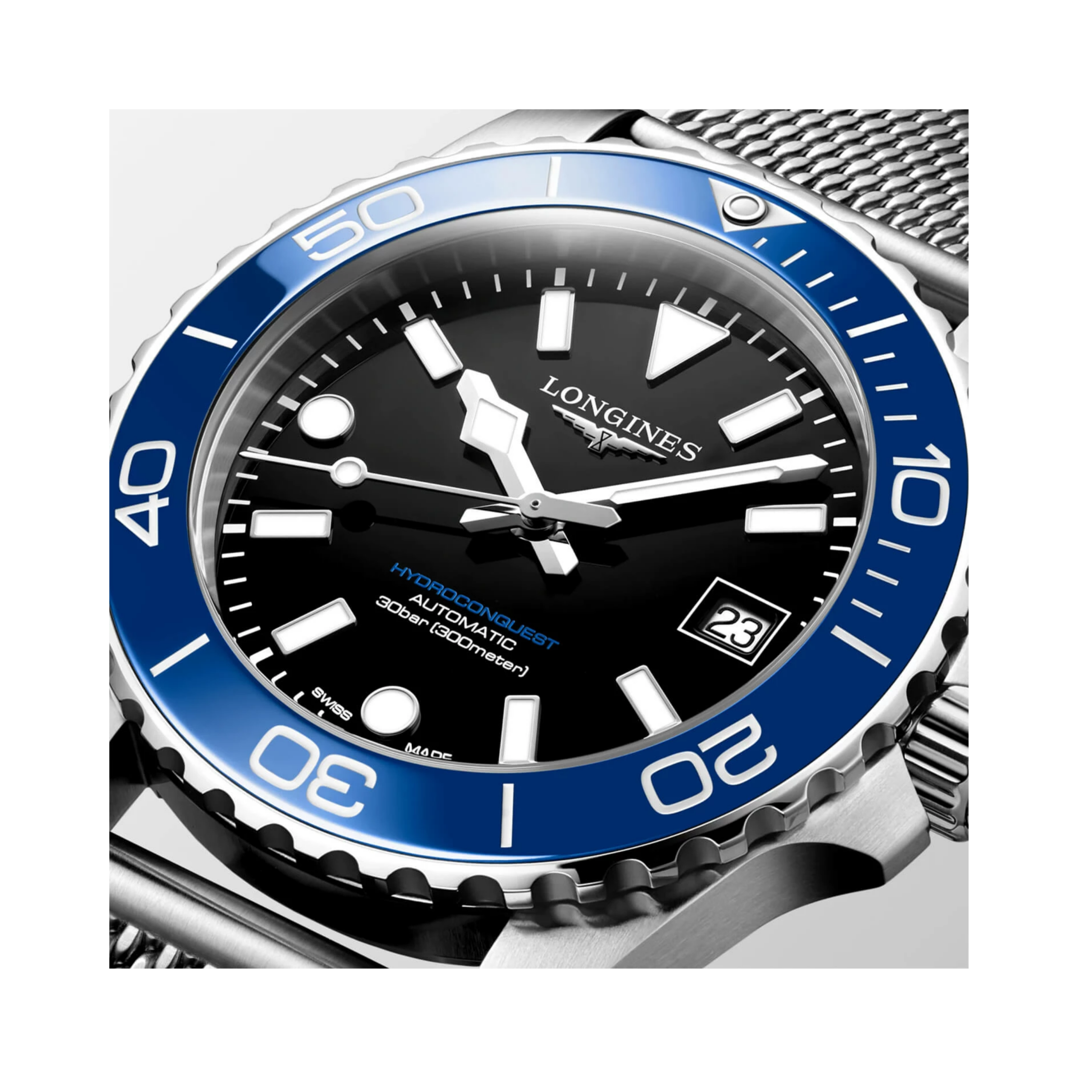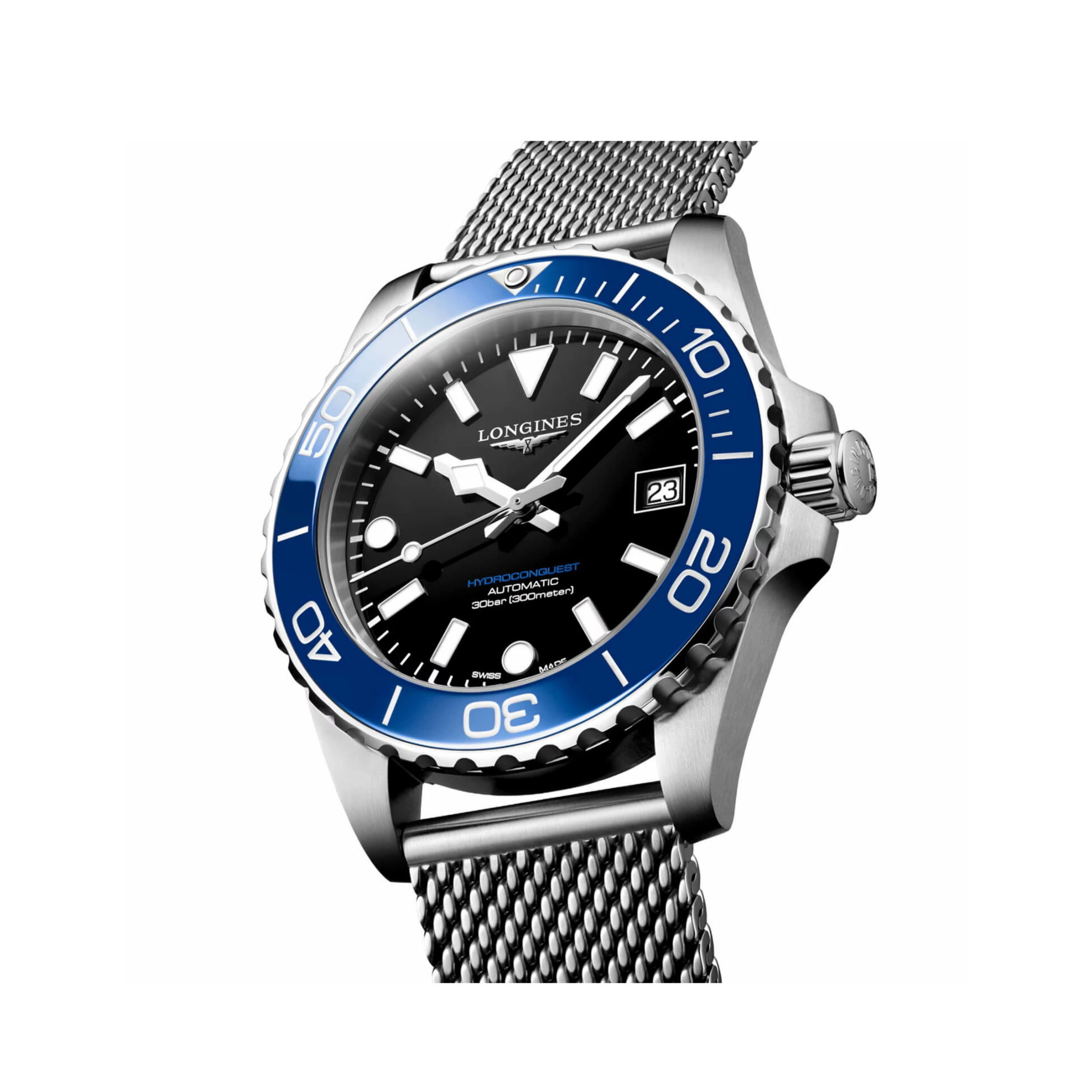 Longines revisite sa collection emblématique avec cette nouvelle HydroConquest : une montre de plongée de haute performance qui marie habilement robustesse technique et élégance classique. Son boîtier en acier est couronné d’une lunette en céramique bleue, encadrant un cadran noir laqué. Animé par un calibre automatique exclusif LONGINES, étanche jusqu’à 30 bar (300 m), avec lunette unidirectionnelle, couronne et fond vissés, ce modèle se décline en 2 tailles : 39 et 42mm.