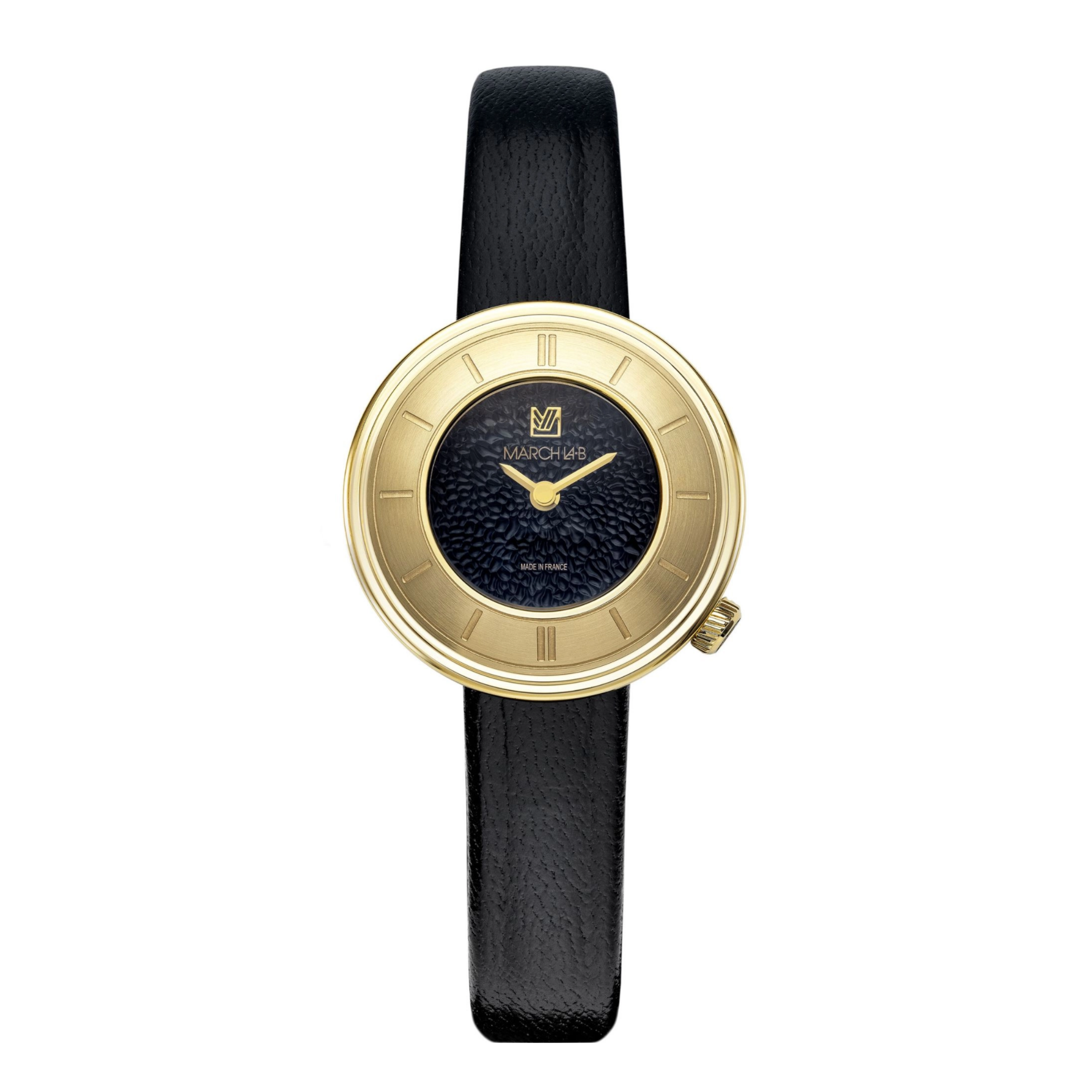 Le modèle Caviar Supreme se distingue par son cadran noir à la finition perlée, évoquant les grains précieux du caviar. Ce jeu de textures brutes contraste magnifiquement avec son boîtier de 30 mm doré en PVD et son bracelet en cuir noir texturé.