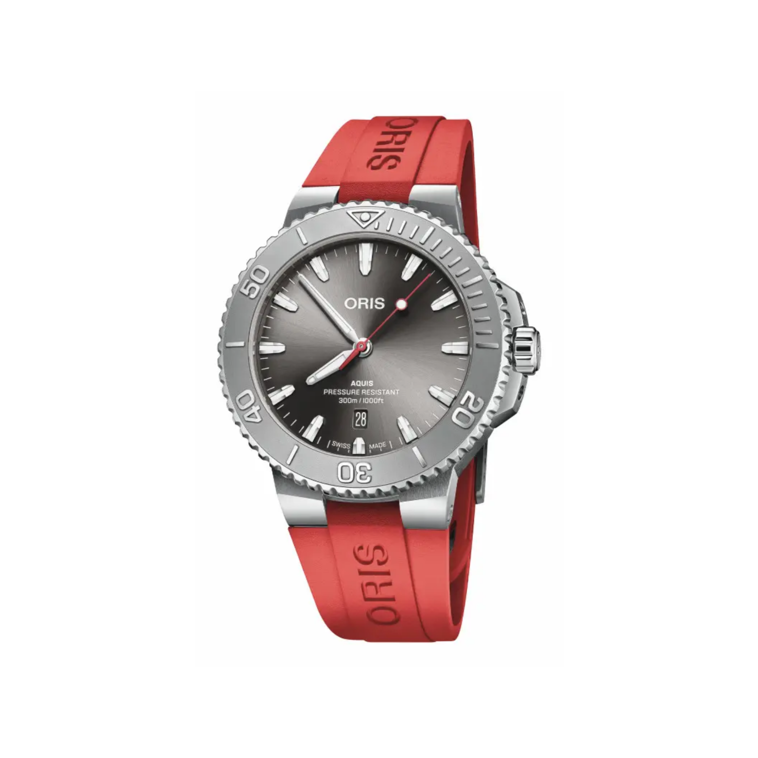 La particularité de cette Aquis Date Relief ? Une échelle des minutes en relief sur la lunette, qui lui confère une belle profondeur. Et à noter aussi : le cadran gris soleillé qui s’unit à une trotteuse « lollipop » rouge, spécifique à ce modèle.